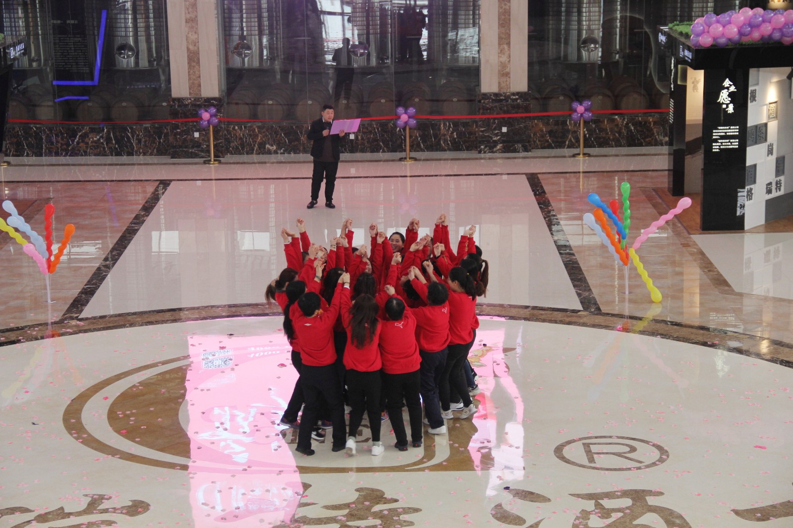 頒獎(jiǎng)之后,所有女神們圍成了一個(gè)同心圓,與相鄰伙伴手牽手,根據(jù)主持人的口令做出花開(kāi)與花謝的動(dòng)作,象征格瑞特酒莊團(tuán)結(jié)一致,并預(yù)祝格瑞特酒莊明天更加燦爛。